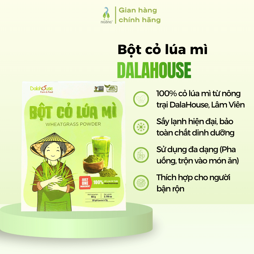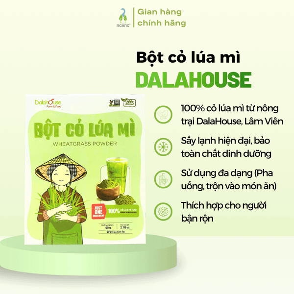 Bột cỏ lúa mì DalaHouse được làm từ 100% cỏ lúa mì tươi trồng tại nông trại DalaHouse (Lâm Đồng), thu hoạch đúng thời điểm và sấy lạnh ở nhiệt độ thấp giúp giữ trọn enzyme, diệp lục và dưỡng chất tự nhiên. Không phụ gia, không chất bảo quản - sản phẩm đạt tiêu chuẩn FDA, ISO 22000, Non-GMO, là lựa chọn an toàn, tiện lợi cho người muốn bổ sung rau xanh và thanh lọc cơ thể mỗi ngày.