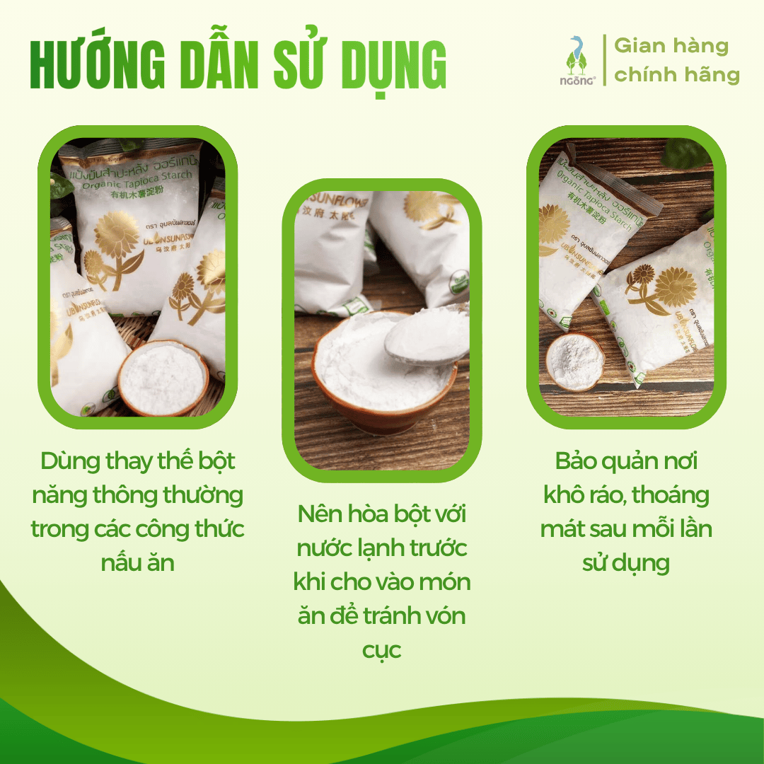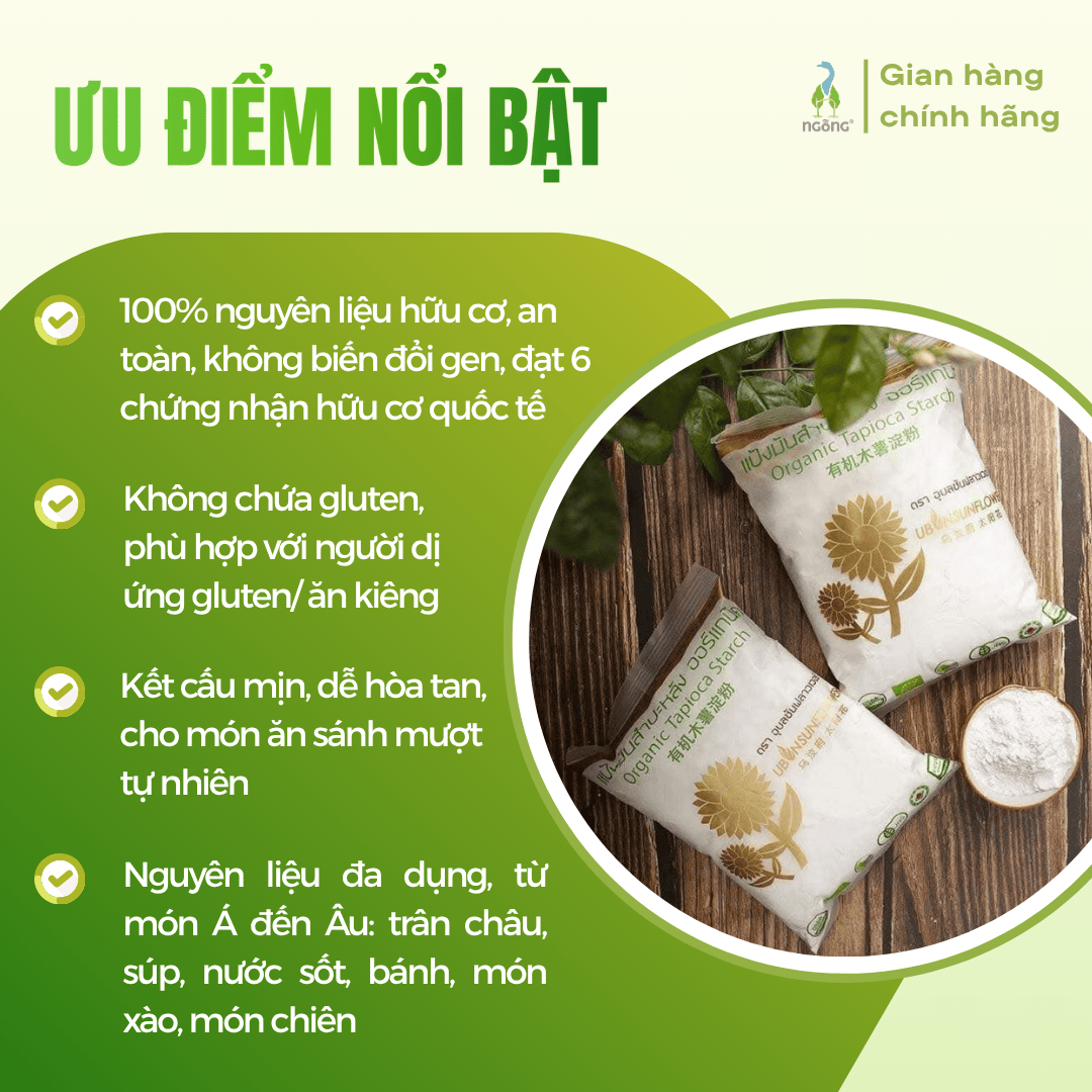 → Bột năng Ubon được làm từ củ sắn hữu cơ 100%, không chứa gluten, đạt 6 chứng nhận hữu cơ quốc tế. Đây có thể coi là điểm cộng bảo chứng cho chất lượng của Bột năng Ubon.