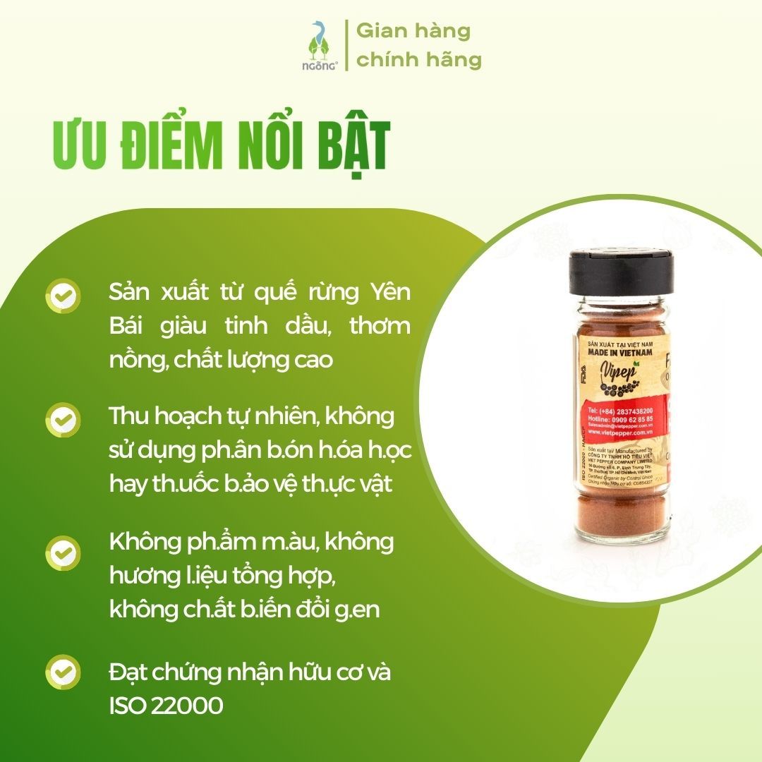 Bột quế VIPEP Farmer 40g là loại gia vị truyền thống được chế biến từ quế Yên Bái – vùng nguyên liệu nổi tiếng với hàm lượng tinh dầu cao và hương thơm nồng đậm đặc trưng. Không chỉ được dùng phổ biến trong các món ăn Á – Âu, bột quế còn là nguyên liệu thiên nhiên đa năng trong chăm sóc sức khỏe, làm đẹp và khử mùi không gian sống.