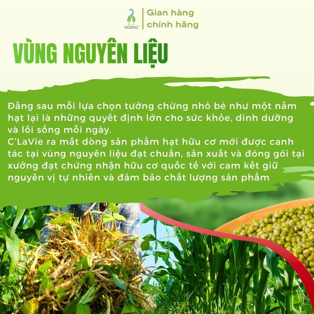 Đậu xanh hữu cơ C’LaVie được canh tác theo tiêu chuẩn hữu cơ EU, 100% hạt nguyên chất, không chất bảo quản tổng hợp, không thuốc trừ sâu hóa học. Hạt đậu giàu protein, chất xơ, vitamin và khoáng chất, là nguồn dinh dưỡng lành mạnh, phù hợp cho chế độ ăn xanh – sạch – an toàn.