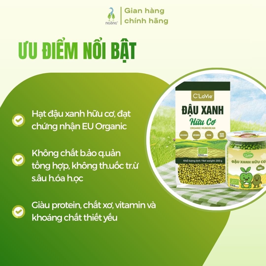Đậu xanh hữu cơ C’LaVie 200g – “siêu thực phẩm” xanh, giàu dinh dưỡng, giúp thanh nhiệt, làm mát, hỗ trợ tiêu hóa và làm đẹp tự nhiên. Cảm ơn bạn đã tin chọn sản phẩm tại Ngỗng!