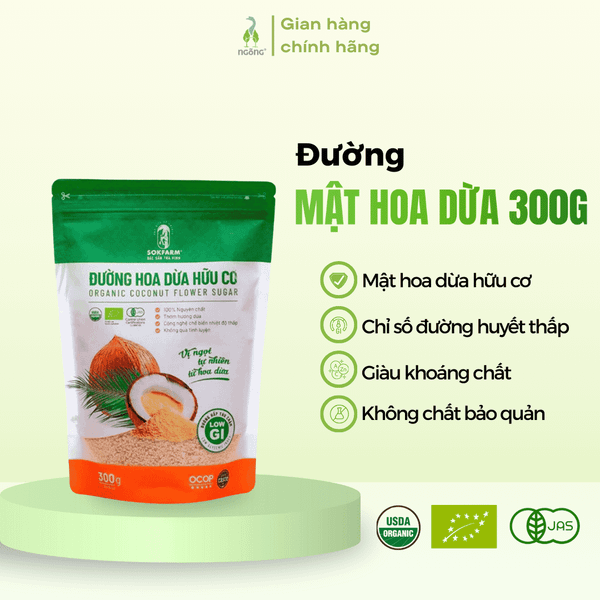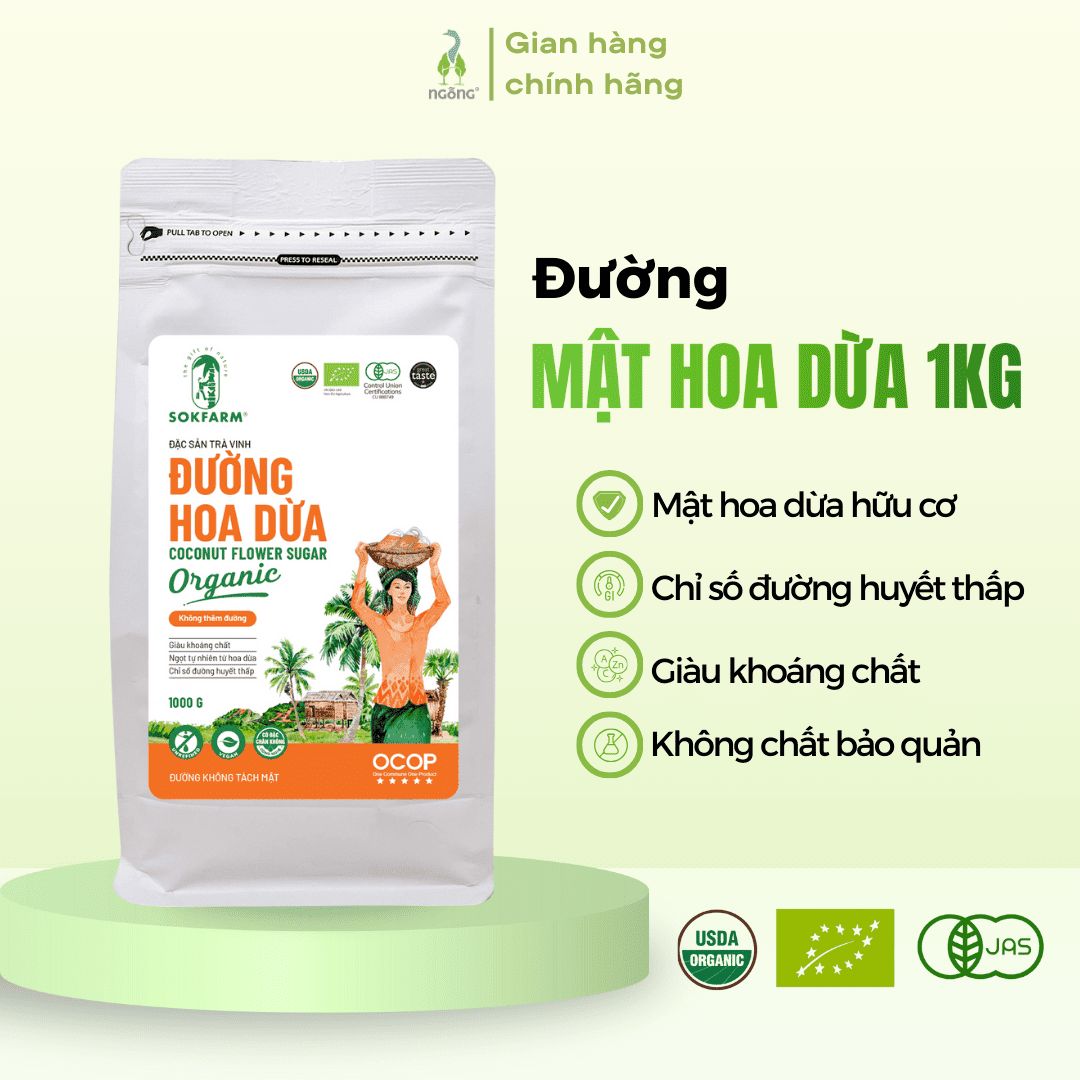 Đường mật hoa dừa Sokfarm hữu cơ nguyên chất organic - thay đường tinh luyện, tăng cường sức khỏe, hỗ trợ ăn kiêng - đóng túi 300g, 1kg. Đường mật hoa dừa Sokfarm hữu cơ là giải pháp ngọt tự nhiên, an toàn và lành mạnh từ Trà Vinh, mang đến hương vị ngọt thanh, thuần chay và tốt cho sức khỏe. Được làm từ 100% mật hoa dừa hữu cơ, sản phẩm có chỉ số đường huyết (GI) thấp, là lựa chọn lý tưởng thay thế đường tinh luyện trong chế độ ăn uống lành mạnh, giúp duy trì năng lượng ổn định và hỗ trợ sức khỏe mỗi ngày.