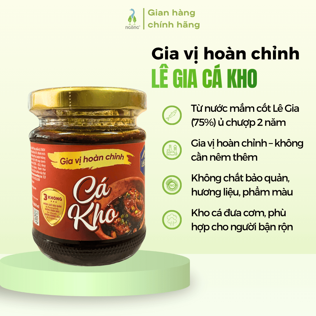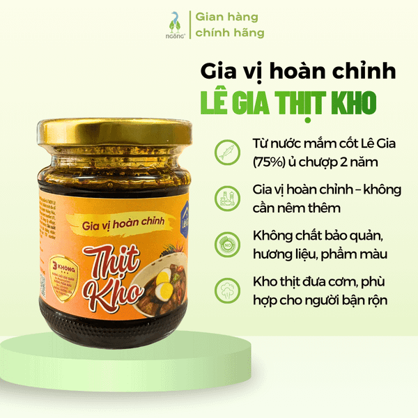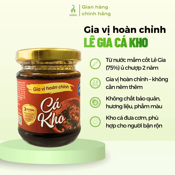 Gia vị kho cá Lê Gia là giải pháp tiện lợi, an toàn và chuẩn vị cho bữa cơm Việt. Chỉ cần ướp và kho, bạn sẽ có ngay món cá kho đậm đà – thịt săn chắc – nước kho sánh kẹo màu tự nhiên – thơm mùi riềng dứa đặc trưng. Sản phẩm được làm từ nước mắm cốt ủ chượp truyền thống, kết hợp đường hoa mai, nước cốt dừa, riềng, tiêu, nghệ, hành tím, dứa, theo quy trình đạt chuẩn ISO 22000/FSSC 22000, HACCP/FDA. Sản phẩm không phẩm màu – không chất bảo quản – không hương liệu – giữ trọn hương vị tự nhiên, đậm đà chuẩn vị Việt.