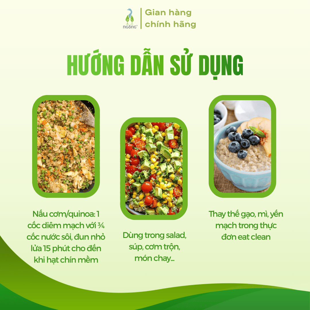 Nấu cơm/quinoa: 1 cốc diêm mạch với ¾ cốc nước sôi, đun nhỏ lửa 15 phút cho đến khi hạt chín mềm