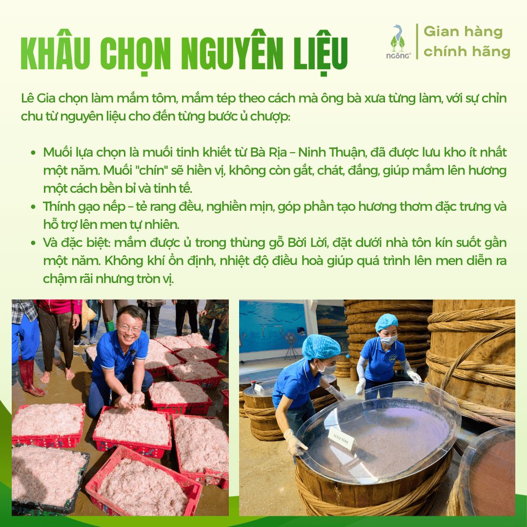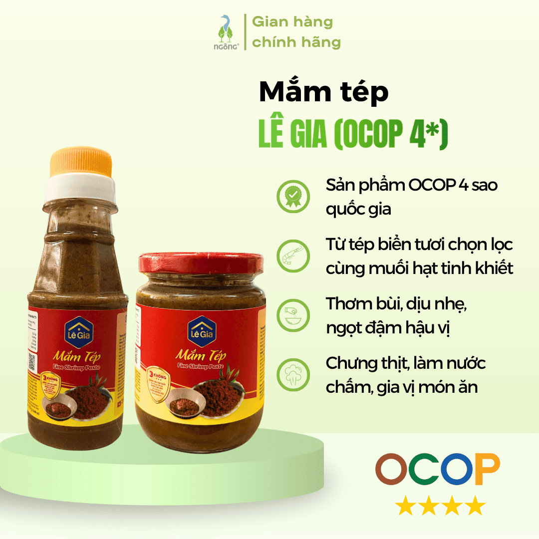Mắm tép chưng thịt Lê Gia – món ngon dân dã mang hương vị truyền thống Việt. Sản phẩm được làm từ tép biển tươi chọn lọc, kết hợp muối tinh khiết, thính gạo, riềng, tỏi, ớt ngọt, lên men tự nhiên trong thùng gỗ Bời Lời theo công thức cổ truyền. Sản phẩm đạt chuẩn OCOP 4 sao, HACCP, ISO 22000, hoàn toàn không phẩm màu, không chất bảo quản, không hương liệu – thơm bùi, đậm đà, an toàn cho sức khỏe.
