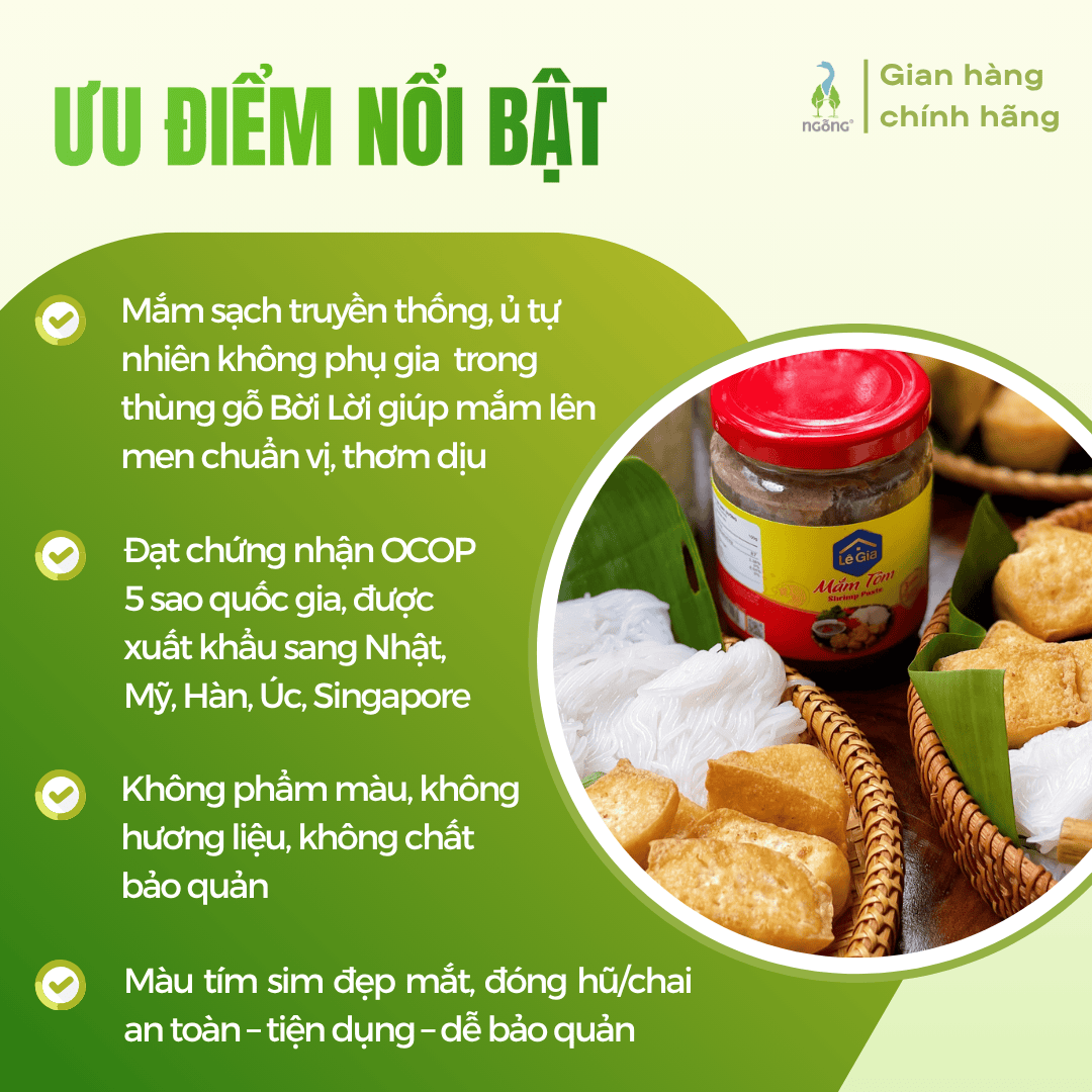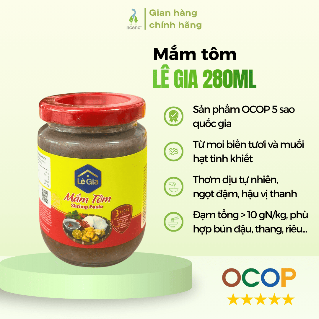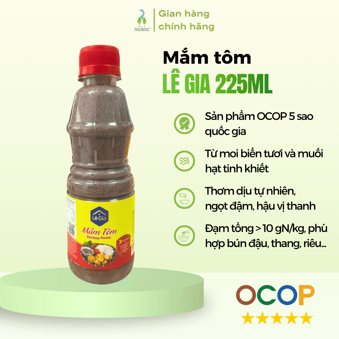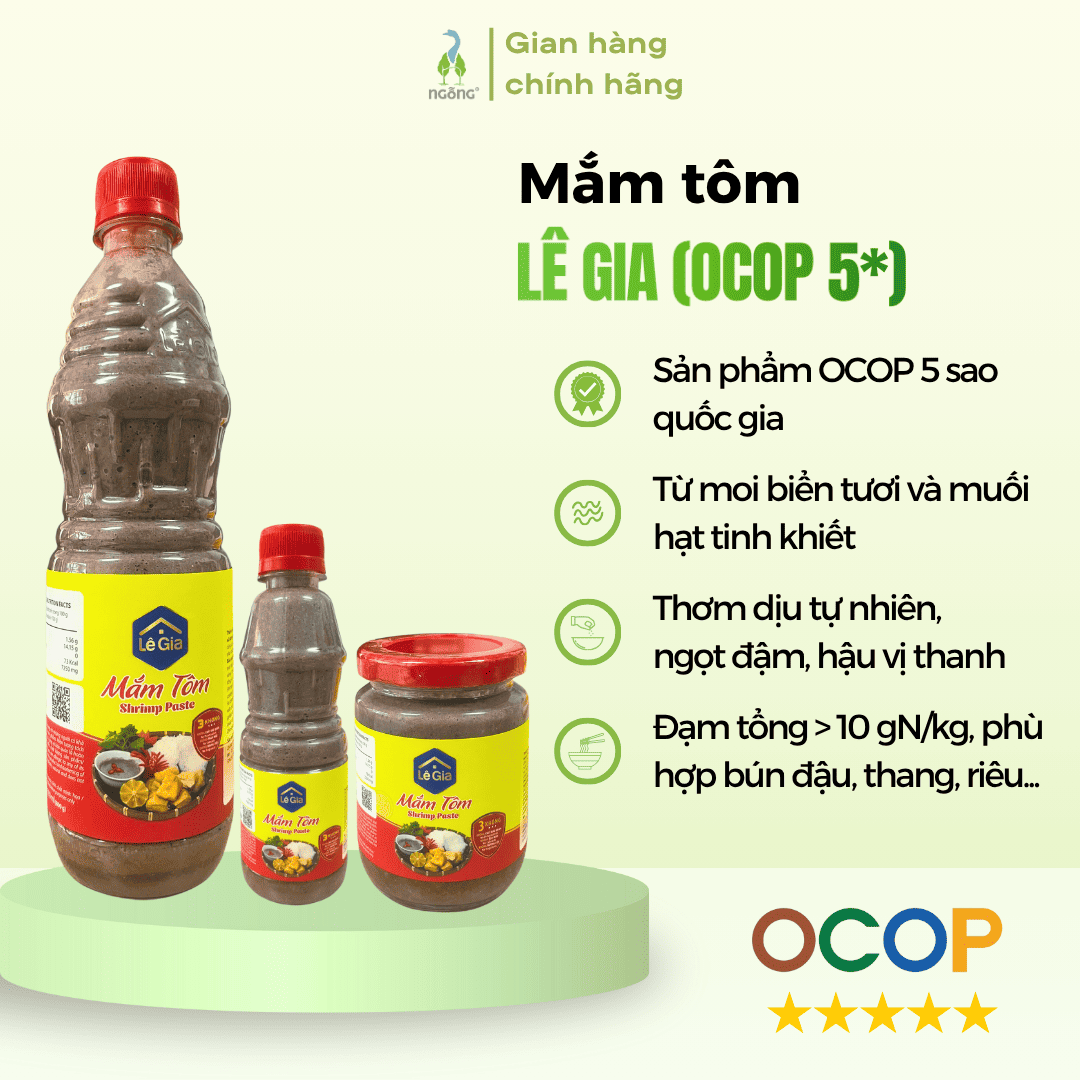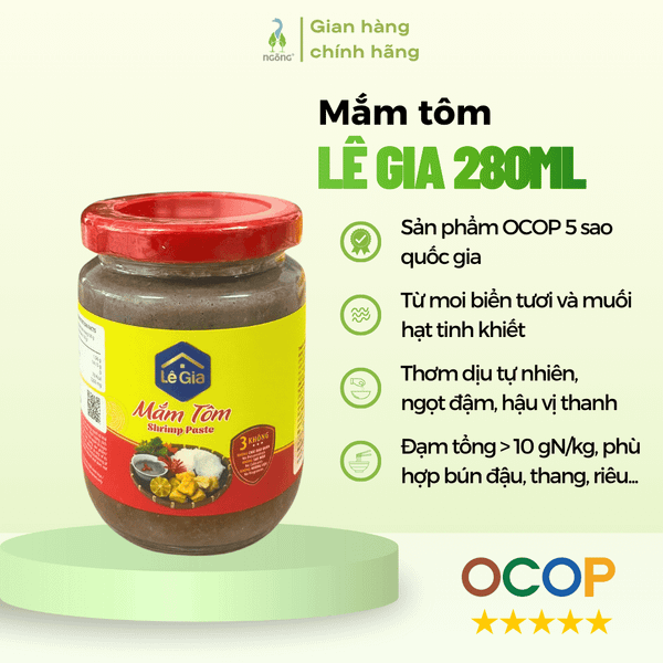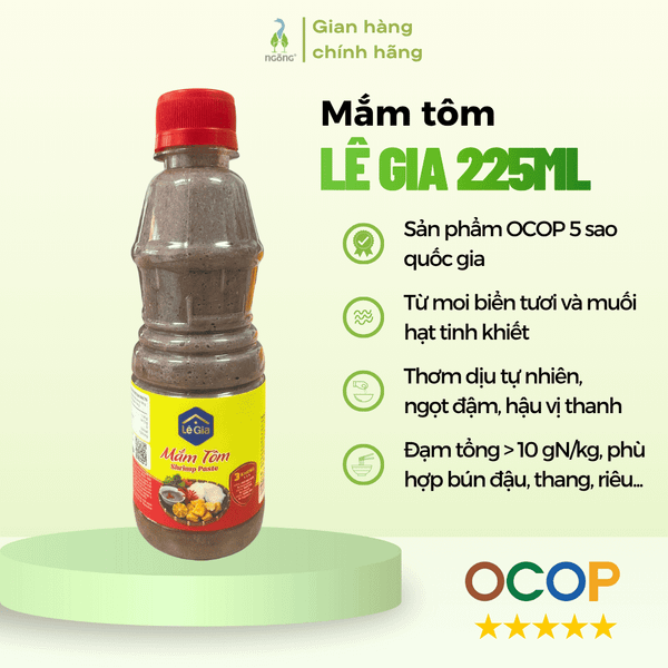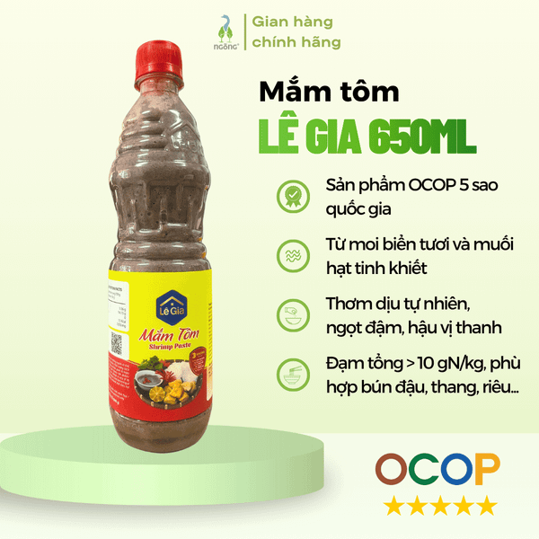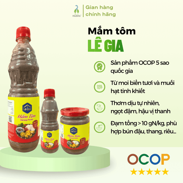 Mắm tôm Lê Gia – sản phẩm OCOP 5 sao quốc gia, được ủ chượp tự nhiên từ moi biển tươi và muối hạt tinh khiết, theo phương pháp truyền thống hơn 10–12 tháng trong thùng gỗ Bằng Lăng. Thành phẩm có màu sim tím đẹp mắt, mùi thơm dịu tự nhiên, vị ngọt đậm nhưng thanh hậu vị – đúng chuẩn tinh hoa làng nghề Việt.