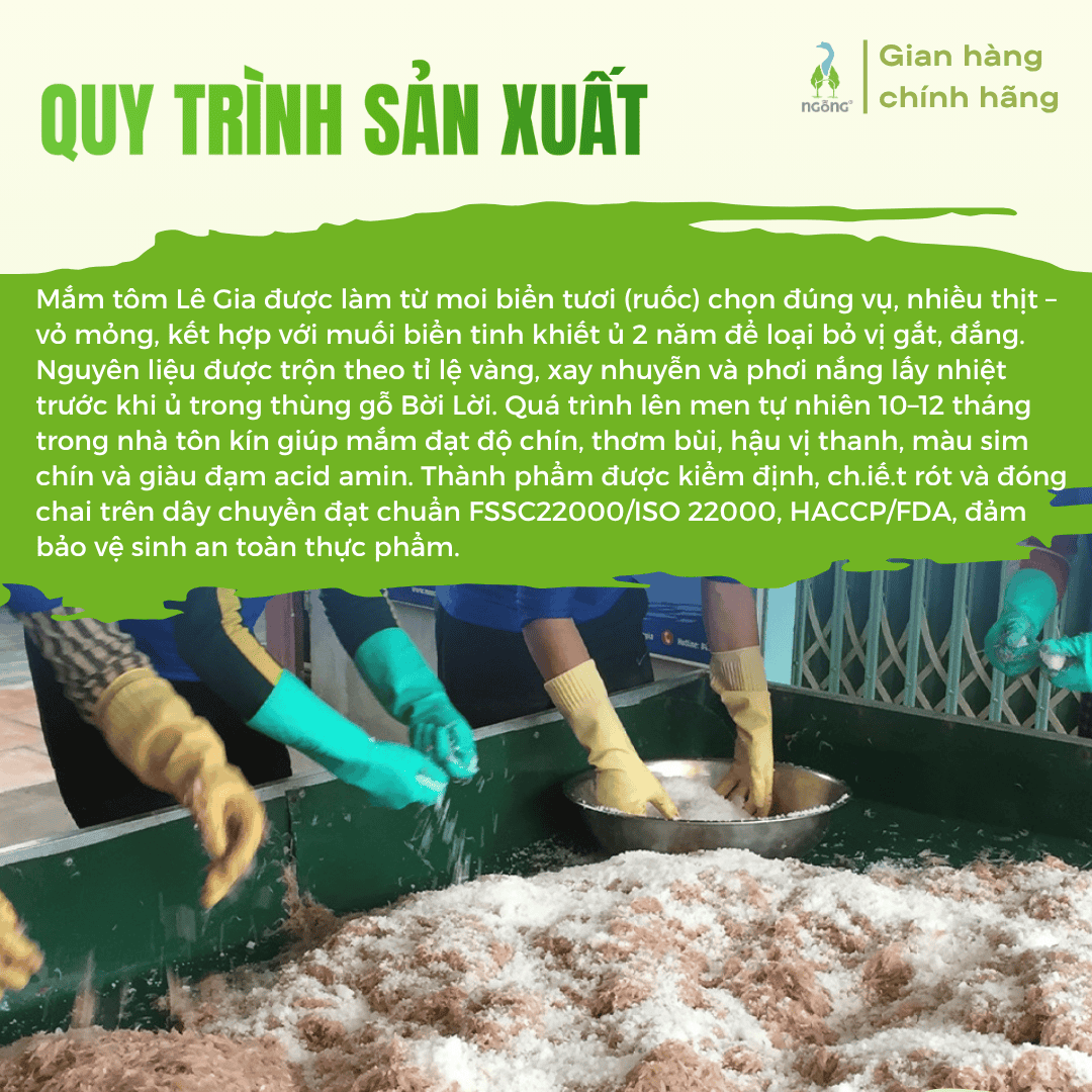 → Mắm Lê Gia được ủ trong thùng gỗ Bằng Lăng 10–12 tháng, không phụ gia, cho vị thơm dịu, ngọt thanh, không hăng gắt như loại công nghiệp.