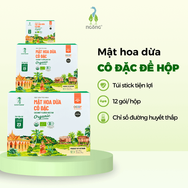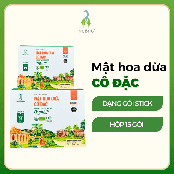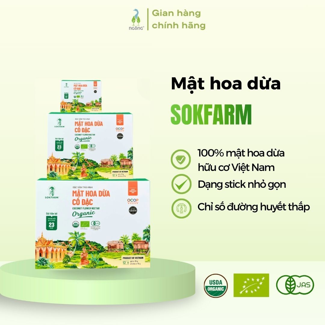 Mật hoa dừa Sokfarm – đặc sản Trà Vinh, được trích ly trực tiếp từ hoa dừa tươi. Người nông dân mỗi ngày phải trèo lên cây dừa (3–10 năm tuổi) để “mát-xa” hoa, cắt mặt và thu mật hoa về. Sau đó, mật được cô đặc bằng công nghệ chân không, cần đến 8 lít mật tươi để tạo thành 1 lít mật cô đặc, giữ trọn dưỡng chất và hương vị nguyên bản. Sản phẩm thiết kế dạng gói stick 15g nhỏ gọn, dễ mang theo, giúp bổ sung năng lượng và khoáng chất tự nhiên mọi lúc mọi nơi.