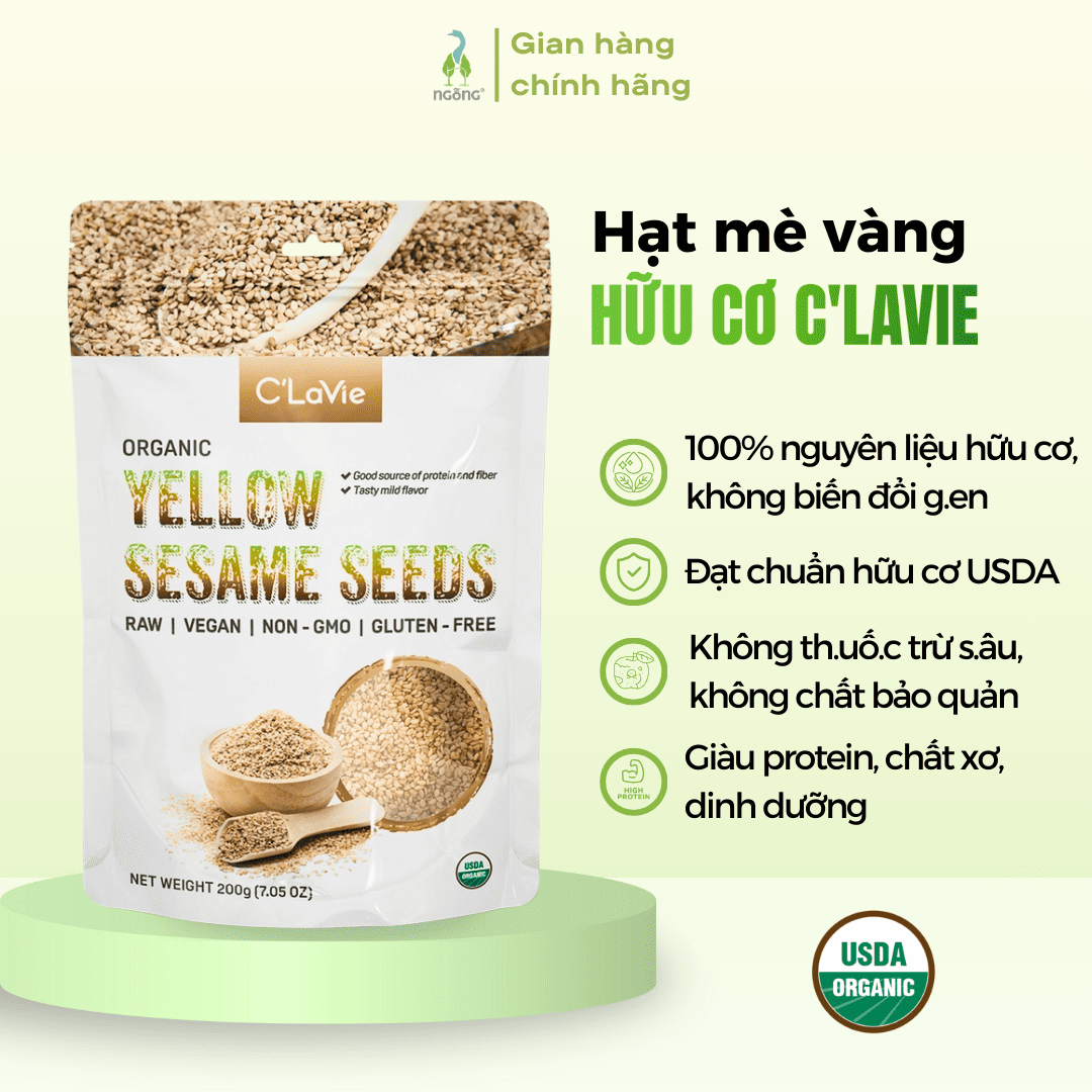 Mè vàng hữu cơ C’LaVie – sản phẩm đạt chứng nhận USDA Organic và an toàn thực phẩm HACCP, chứa 100% hạt mè vàng hữu cơ, không biến đổi gen, không thuốc trừ sâu hóa học, không chất bảo quản, an toàn tuyệt đối cho cả gia đình.