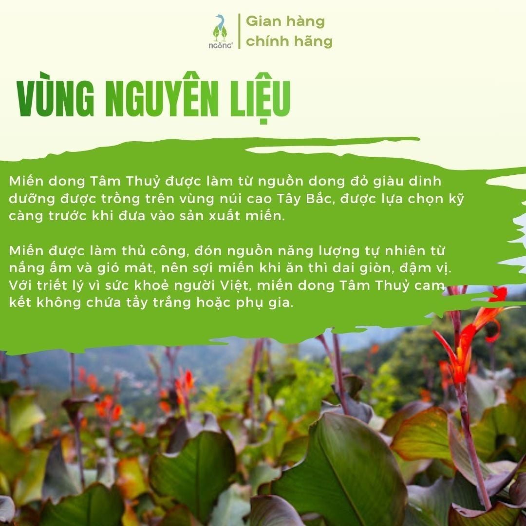 → Miến dong Tâm Thủy được làm thủ công từ dong đỏ Tây Bắc, không tẩy trắng, không phụ gia, giữ trọn vị ngọt và độ dai giòn tự nhiên.