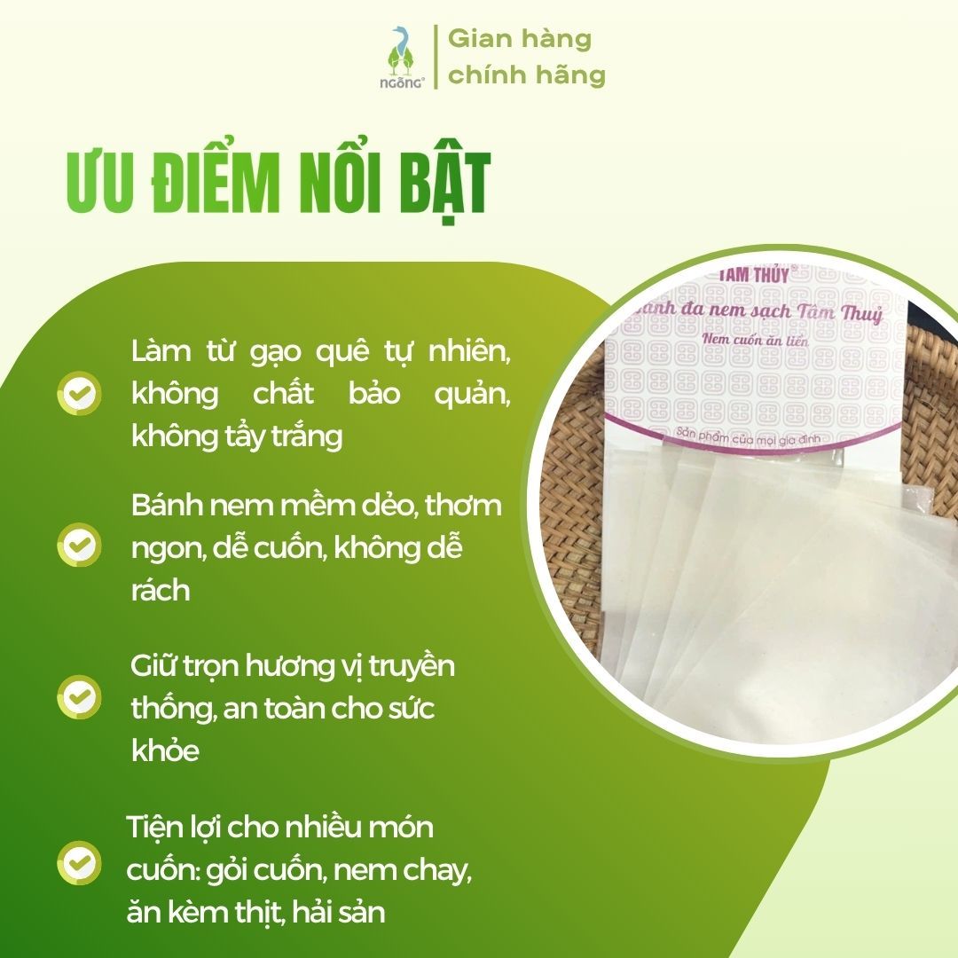 Nem cuốn Tâm Thủy được làm thủ công từ gạo quê, không tẩy trắng, không hóa chất nên có độ mềm dẻo tự nhiên, dễ cuốn, không bị bở nát như nhiều loại bánh tráng công nghiệp.