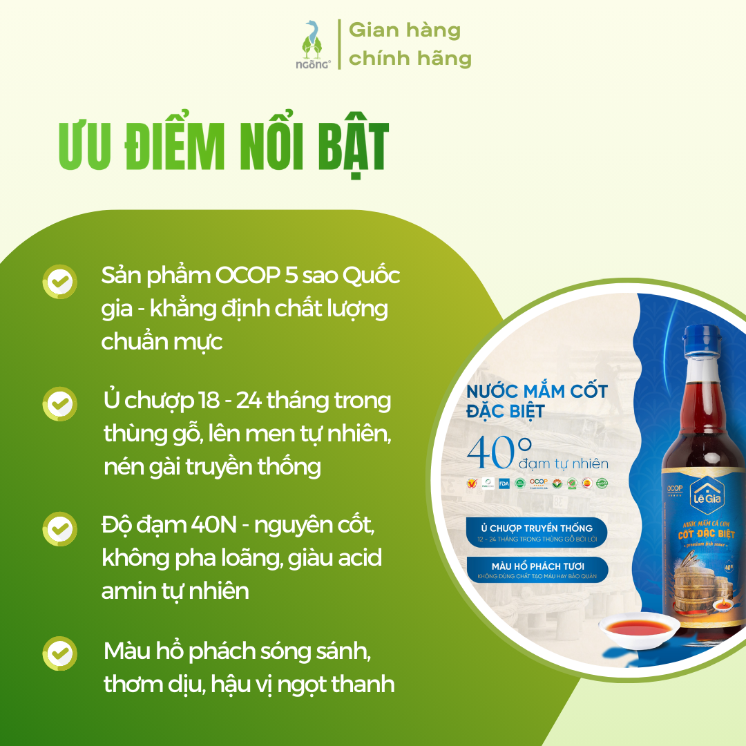 Nước Mắm Lê Gia Cốt Đặc Biệt 40N – tinh hoa mắm Việt, chuẩn vị truyền thống, hậu vị thanh – thơm dịu, xứng danh sản phẩm OCOP 5 sao Quốc gia. Cảm ơn bạn đã chọn mua sản phẩm tại Ngỗng!
