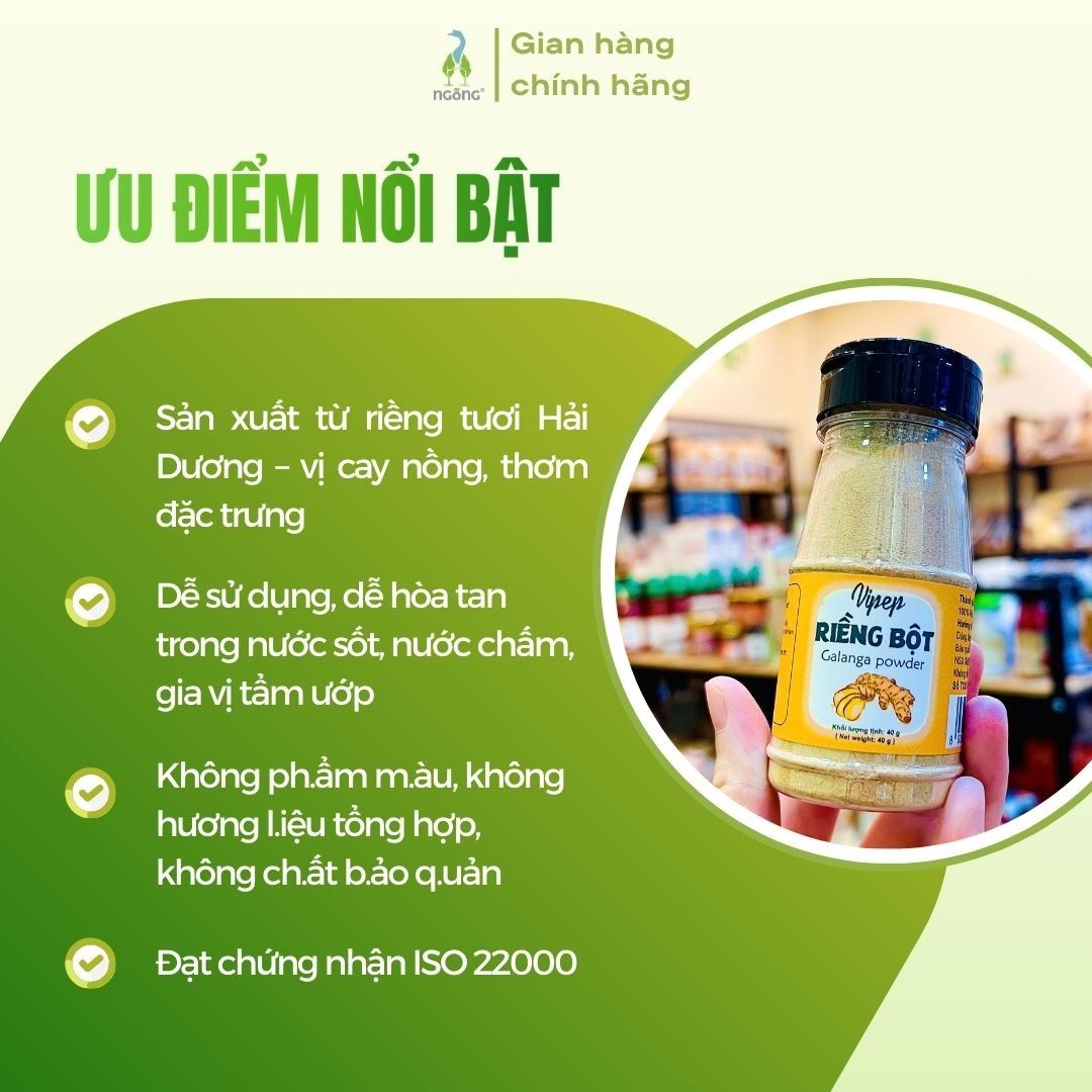 Riềng bột VIPEP 40g được sản xuất từ củ riềng tươi vùng Hải Dương – nổi tiếng với hương thơm cay nồng đặc trưng. Đây là loại gia vị truyền thống giúp làm dậy vị món ăn, đặc biệt thích hợp với các món kho, nướng, hầm, súp và cháo. Ngoài công dụng nấu ăn, riềng bột còn hỗ trợ chăm sóc sức khỏe hiệu quả nhờ hàm lượng tinh dầu tự nhiên.