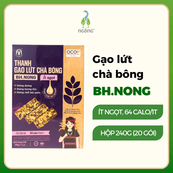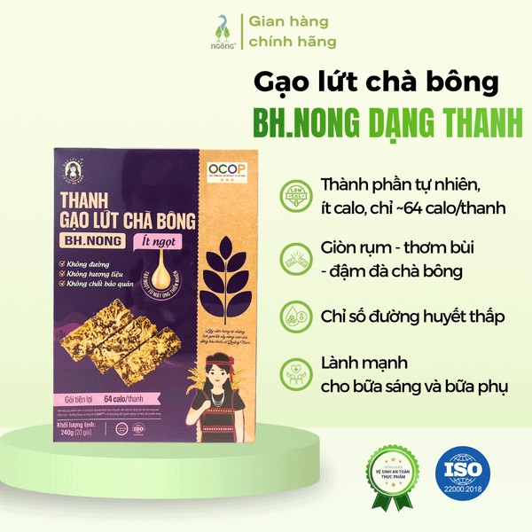 Thanh gạo lứt chà bông Bh.nong là lựa chọn lý tưởng cho bữa sáng và bữa phụ lành mạnh. Với hạt gạo lứt rẫy Quảng Nam rang giòn hòa quyện cùng chà bông đậm đà và mật ong tự nhiên, sản phẩm mang đến hương vị thơm bùi, giòn rụm – vừa ngon miệng, vừa tốt cho sức khỏe.