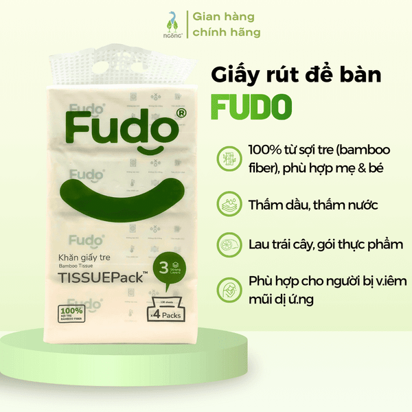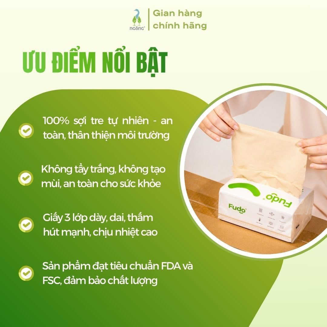 Khăn giấy rút Fudo được làm từ 100% sợi tre bamboo không tẩy trắng, không tạo mùi, đạt chứng nhận FDA & FSC. Giấy 3 lớp dày dai, thấm hút tốt, mềm mịn, an toàn cho cả trẻ nhỏ và mẹ bầu.