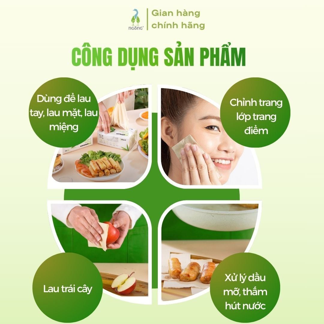 Sản phẩm không chứa hóa chất độc hại, không gây kích ứng, thân thiện với môi trường và dùng đa năng cho bàn ăn, lau tay, lau mặt, thấm dầu hay gói thực phẩm.