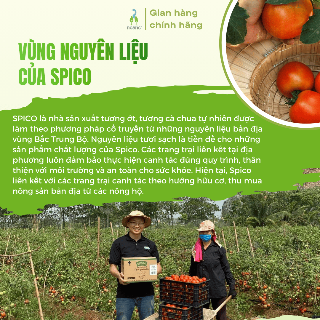 Spico là thương hiệu tương ớt, tương cà tự nhiên được sản xuất theo phương pháp truyền thống từ nguyên liệu bản địa vùng Bắc Trung Bộ. Mỗi chai tương đều mang đậm hương vị quê hương, an toàn và giàu giá trị ẩm thực.