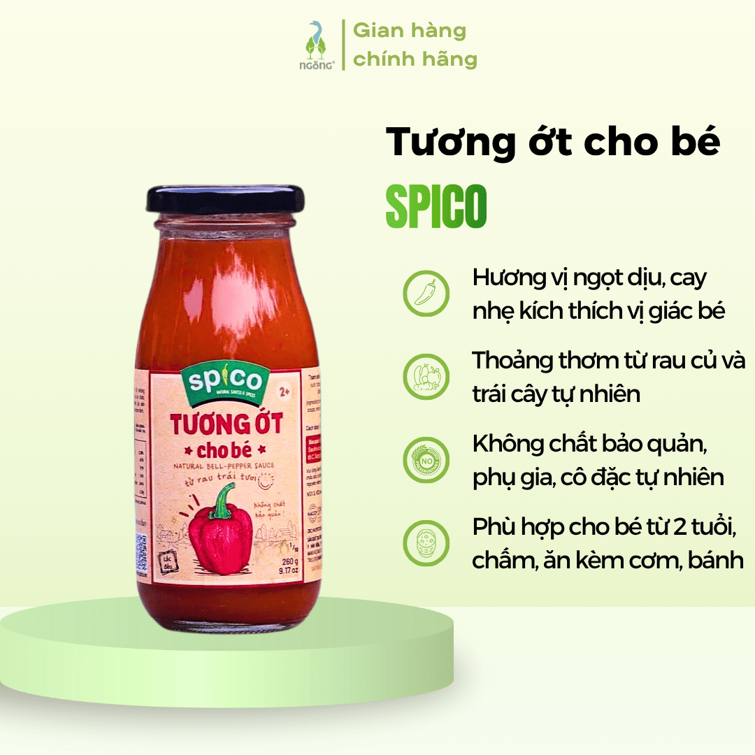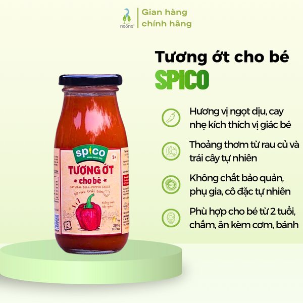 Tương ớt cho bé SPICO là dòng sản phẩm lành mạnh, tự nhiên, được chế biến từ ớt chuông, cà chua, bí đỏ, phù hợp với trẻ nhỏ từ 2 tuổi. Với công thức ít cay – thơm ngọt – giàu dinh dưỡng, tương ớt SPICO giúp bé làm quen với vị cay tự nhiên một cách nhẹ nhàng, đồng thời bổ sung vitamin và chất xơ từ rau củ. Sản phẩm không chất bảo quản – không phụ gia – không phẩm màu, được cô đặc bằng nhiệt tự nhiên, giữ trọn màu sắc và hương vị nguyên bản của rau củ.