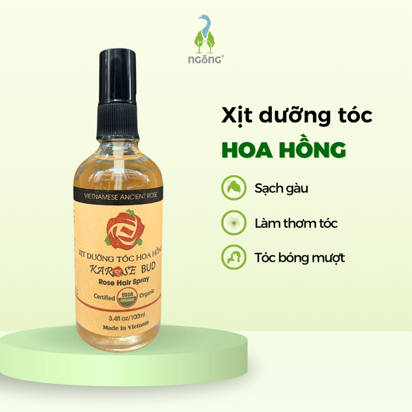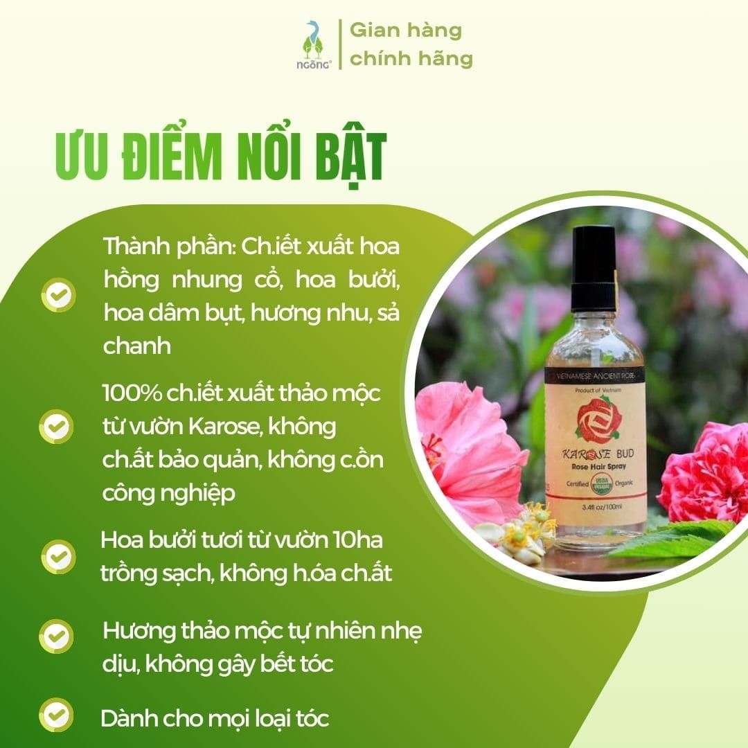 Xịt dưỡng mọc tóc Karose Bud 100ml là sản phẩm xịt tóc thiên nhiên với công thức từ hoa hồng, bưởi, hương nhu, sả chanh và dâm bụt. Sản phẩm giúp giảm gãy rụng, kích thích mọc tóc và làm dịu da đầu nhạy cảm. Với hương thơm thảo mộc dịu nhẹ, sản phẩm không gây bết tóc, phù hợp dùng hằng ngày.